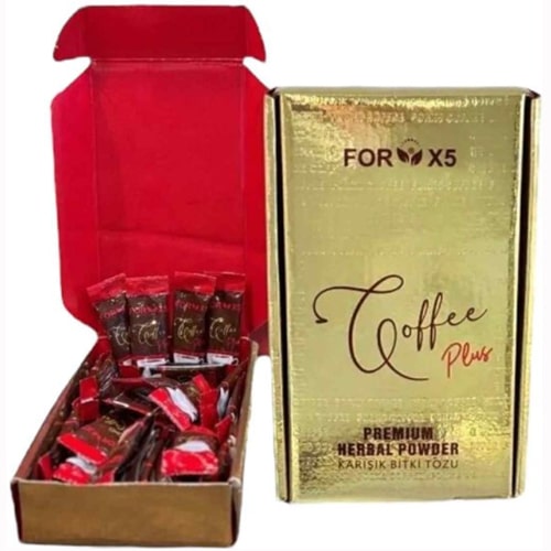 Forx5 Kahve PLUS; geliştirilmiş formül, orjinal kutusunda kırmızı poşetli granül toz kahve